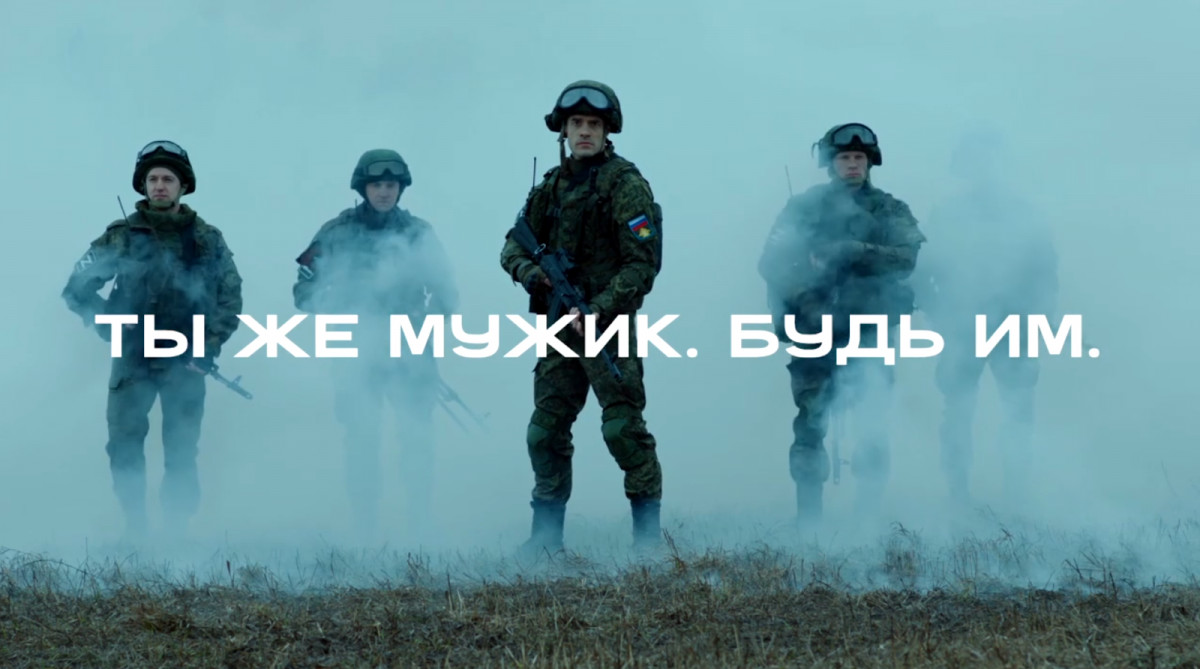 «Ты же мужик. Будь им». Скрін реклами рекрутингу в російську армію. Ролик пропагував відмовитися від «немужніх» мирних професій охоронця у супермаркеті, тренера у спортзалі й таксиста на користь «мужньої» професії військового, 2024 рік. Джерело: Сторінка «KP.RU:Комсомольская правда» на dzen.ru