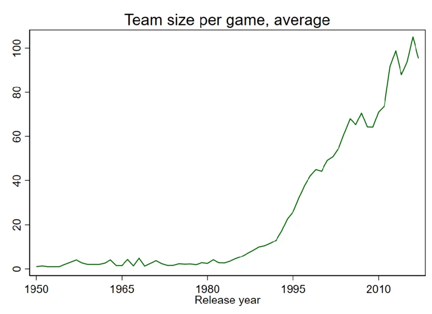 Подальший розвиток індустрії характерезується збільшенням розриву між безпосередніми розробниками ігор, розробниками програмної інфраструктури (англ. software) та виробниками технічного забезпечення (англ. hardware). У сфері розробки ігор відбувається ускладнення, стандартизація й дедалі глибший поділ праці. Перші ігри — на кшталт Pong (1972), Adventure (1980) або Pacman (1980) — створювалися однією людиною або невеличкими командами. На початку 1990-х така модель все ще зберігається, і чимало популярних ігор розробляють колективи до десяти осіб: Sonic the Hedgehog (1991) мала 7 розробників, The Secret of Monkey Island (1990) — менше 10, Myst (1993) — 7. Але поряд із ними виростають значно більші команди. Так, до розробки Super Mario 64 (1994) було задіяно від 15 до 20 осіб, Pokémon Red/Blue (1996) — 31 розробник, а в окремих випадках — як-от із Final Fantasy VII (1997) — кількість працівників сягала від 100 до 150.