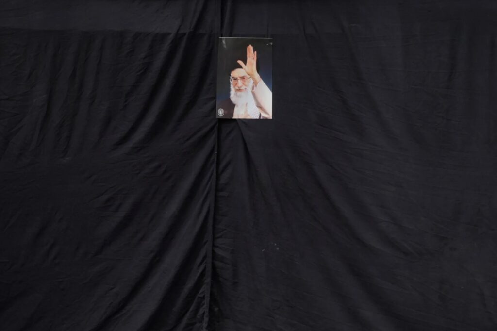 A photograph of the killed Supreme Leader of Iran, Ayatollah Ali Khamenei, on the wall of a mosque in Tehran, March 2, 2026. Photo: Vahid Salemi/AP