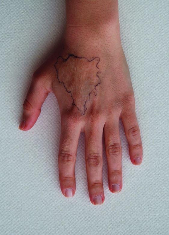 Авторка розповідає, що поверх шраму, отриманого ще в дитинстві, вона нанесла мапу Боснії та Герцеговини, поправляючи її ручкою прямо на шкірі вона підкреслює, що з часом шрам змінюється та зменшується6Borjana Mrđa, Granica, 2010..