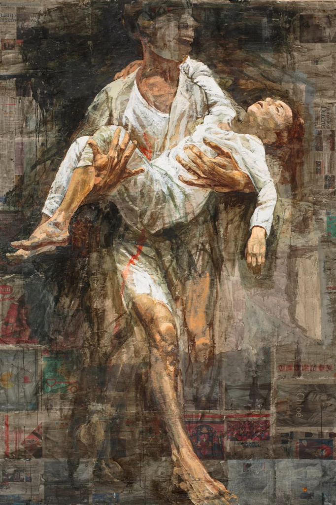 Репортажні знімки з будь-якого українського міста підтвердять здогадку. Коли росіяни обстрілювали Маріуполь у 2022, в новинах з’явилося фото батька, який забігає в лікарню з 18-місячним малюком на руках. Абсолютно та ж динамічна поза, те саме відчуття хаосу та розслаблене тіло дитини в руках схвильованого чоловіка. Той малюк не вижив.