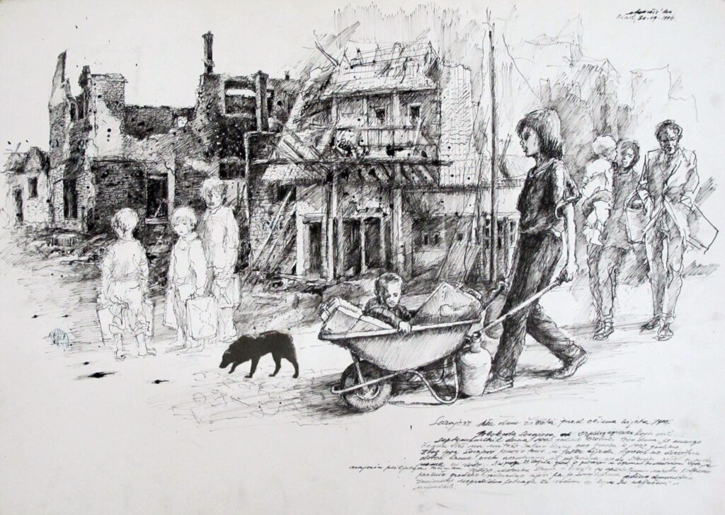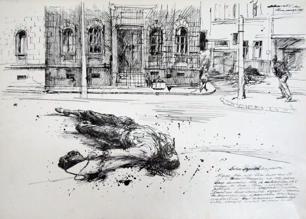 Розстріляні люди, зруйновані будівлі, карети швидкої допомоги, черги з каністрами за водою. Страшні реалії війни в Боснії постають у роботах Мевлудіна Екмечича суто в чорно-білих, начебто поспішних, замальовках. Утім, вони майстерно виконані і дуже деталізовані.