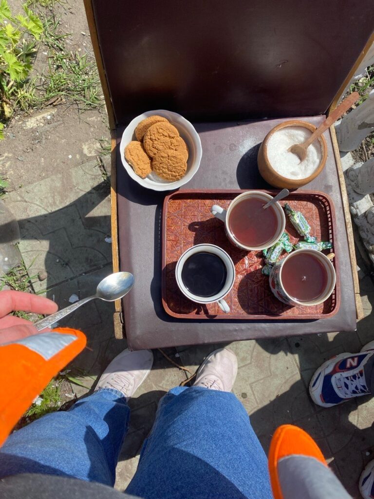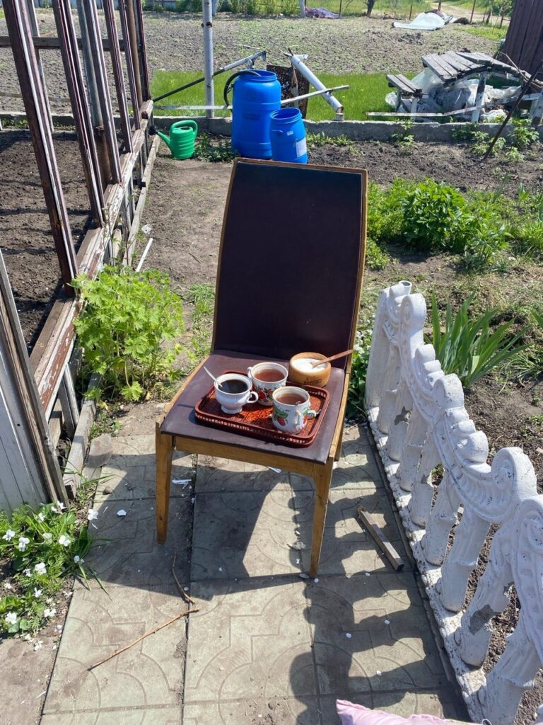 Проживаючи втрату власного будинку та оплакуючи односельчан, вона — подібно до матерів Сребрениці — продовжувала ритуал приготування та спільного пиття кави. У Боснії не прийнято подавати саму лиш каву: на таці в закладах завжди приносять шматочок рахат-лукуму. Так само і в Україні. І ось жіночка з Горенки, навіть опинившись в епіцентрі смерті та руйнувань, дотримувалася гостинного сервірування — цукерки й печиво, бо так прийнято і так гарно.