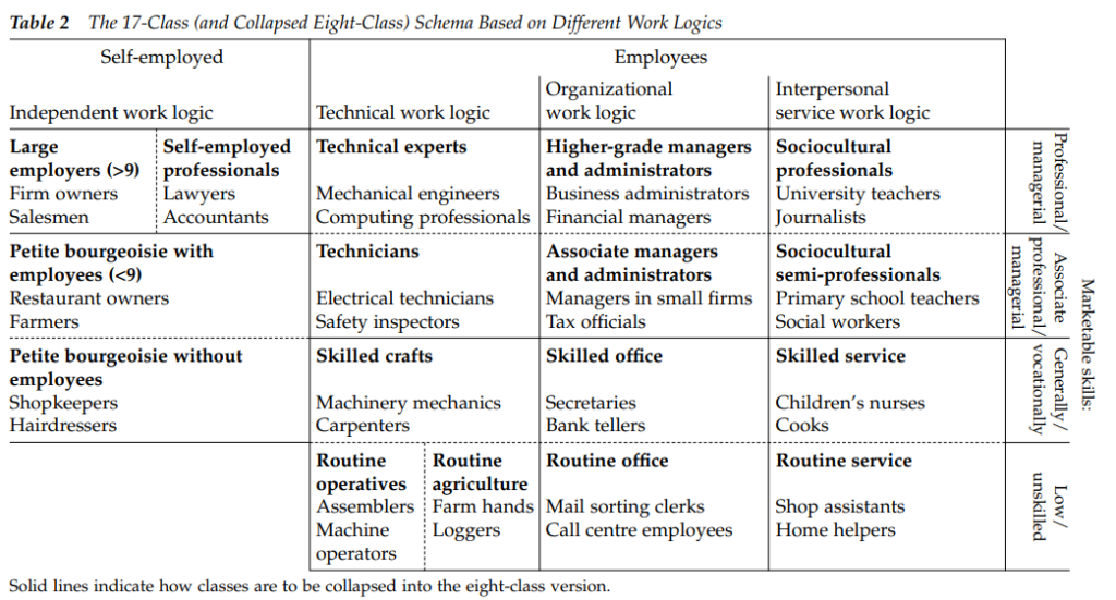 Укоріненість ЕГП у «тумані війни», за яким розгортається розподіл балансу сил між роботодавцями і їхніми підлеглими, для Оша здалася непереконливою. Для нього окремі прошарки у вертикальній ієрархії, тобто за рівнем специфіки навичок, також розрізняються за ознакою, яку він називає «робоча логіка» (англ. work logic)7 Варто відмітити, що Ош не перший застосовує ідею оперативної логіки для типологізації соціальних явищ. Особливо у соціології організацій та інституцій, а також серед мислителів теорій глобалізації ідея різних логік, що фундаментально надихають функціонування різних соціальних структур, займає особливе місце. Таким чином, наприклад, Ніклас Луман у своїй статті «Глобалізація чи світове суспільство? […]» (Luhmann, N. (1997) Globalization or World society: How to conceive of modern society?, International Review of Sociology: Revue Internationale de Sociologie, 7:1, 67–79, DOI: 10.1080/03906701.1997.9971223) писав про світову гомогенізацію інституцій саме завдяки глобальному розповсюдженню їхніх оперативних логік, а неоінституціоналісти вже котре десятиліття займаються дослідженнями того, як інкрементальні зміни у логіках інституцій приводять до відповідних змін у їхній (не)формальній структурі (Lounsbury, M. (2007). A Tale of Two Cities: Competing Logics and Practice Variation in the Professionalizing of Mutual Funds. Academy of Management Journal, 50: 289–307; Marquis, C. & Lounsbury, M. (2007). Vive la Résistance: Competing Logics in the Consolidation of Community Banking. Academy of Management Journal, 50: 799–820.); Schneiberg, M. (2007) ‘What’s on the Path? Path dependence, organizational diversity and the problem of institutional change in the U.S. economy, 1900–1950’. Socio-Economic Review 5: 47–80.).. Ош виділяє чотири їх типи: технічну (англ. technical), організаційну (англ. organizational), міжособистісну (англ. interpersonal) та незалежну (англ. independent). Ці логіки відповідно характеризуються наступними елементами: технічна — процесом праці в межах технічного виробництва; організаційна — менеджментом та бюрократичним розподілом праці, орієнтованими на організацію-роботодавця; міжособистісна — персональною взаємодією з клієнтами. «Незалежна» робоча логіка, на відміну від інших, охоплює власне роботодавців, самозайнятих та власників малого й середнього бізнесу. На жаль, у межах цього огляду немає можливості зануритися у деталі цієї таксономії, проте головною тут залишається спроба виділити якісно відмінні розрізнення у вертикальних структурах суспільства, які б ясніше відображали розмежування між професійними секторами, а не рівень кваліфікації. За Ошем, це якісне розмежування, у свою чергу, здатне чіткіше відобразити і кількісні відмінності у класовому складі тих чи інших суспільств.