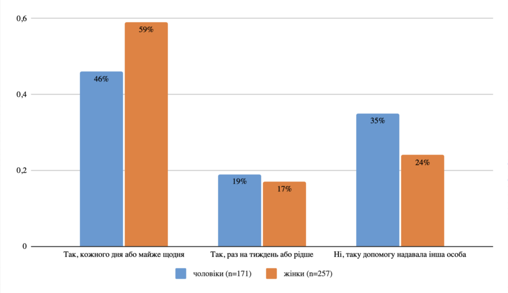Більш об’єктивним показником можуть слугувати відповіді тих людей, які зазначили, що основний догляд забезпечують не вони самі, а інший член сім’ї. За цими даними жінок вдвічі частіше називали основними доглядальницями: у 67% випадків, тоді як чоловіків — у 33%. Отримані результати загалом узгоджуються з міжнародними тенденціями: за даними різних досліджень, чоловіки становлять 20–40% піклувальників про літніх членів сім’ї, залежно від країни. Можна припустити, що в Україні на частку чоловіків, залучених у догляд, певною мірою вплинула повномасштабна війна, зокрема той факт, що виконання доглядових обов’язків є підставою для відстрочки від мобілізації.
