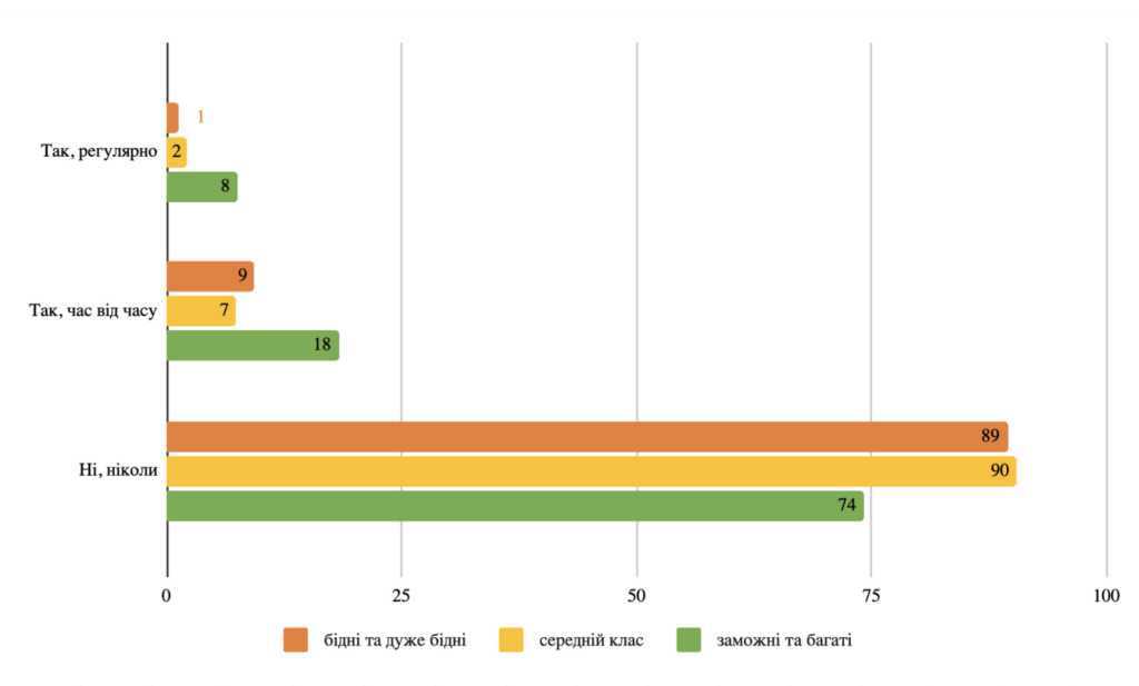 Логічно припустити, що наявність фінансової спроможності має вирішальне значення для того, чи може сім’я найняти доглядальницю. Проте виявилося, що зв’язок між економічним класом та досвідом користування такими послугами, хоча й статистично значущий, є слабким. Так, серед «заможних і багатих» дві третини (74%) ніколи не користувалися оплачуваними послугами догляду порівняно з 89% у групі «бідних і дуже бідних» та 90% у групі «середній клас». Регулярно наймають доглядальниць 8% «заможних і багатих», 2% представників «середнього класу» та 1% «бідних і дуже бідних» (Діаграма 2)2Для ідентифікації економічного класу була використана широко вживана в українській соціології шкала заможності: «Що би ви могли сказати про фінансове становище вашої сім’ї? 1. Змушенi економити на харчуваннi; 2. Вистачає на харчування. Для придбання одягу, взуття необхiдно заощадити або позичити; 3. Вистачає на харчування та необхiдний одяг, взуття. Для таких покупок як гарний костюм, мобiльний телефон, пилосос необхiдно заощадити або позичити; 4. Вистачає на харчування, одяг, взуття, iншi покупки. Але для придбання речей, якi дорого коштують (таких як телевiзор, холодильник) необхiдно заощадити або позичити; 5. Вистачає на харчування, одяг, взуття, дорогi покупки. Для таких покупок як машина, квартира необхiдно заощадити або позичити; 6. Будь-якi необхiднi покупки можу зробити в будь-який час”. Група 1 та 2 віднесені до “бідних і дуже бідних”, 3 та 4 — до “середнього класу”, 5 та 6 — до “заможних і багатих”».