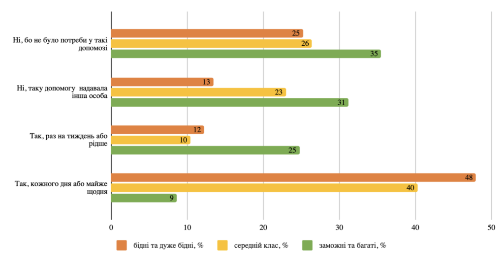 По-третє, я припускаю, що відносно невелика частка «багатих» сімей, які користуються платним доглядом, може бути наслідком кращої медичної підтримки і здоровіших умов, які людина має змогу забезпечити собі протягом життя. У результаті в таких сімʼях рідше трапляються люди з істотно обмеженими або втраченими навичками самообслуговуванням, які потребують щоденного та інтенсивного догляду. Це підтверджується і отриманими даними: серед «багатих і заможних» дещо більше респондентів, які не мають у сім’ї людини з потребою у такому догляді. Якщо ж така людина є, то представники цього класу, опитані особисто, доглядають за нею менш інтенсивно та частіше покладаються на допомогу інших осіб (Діаграма 3).